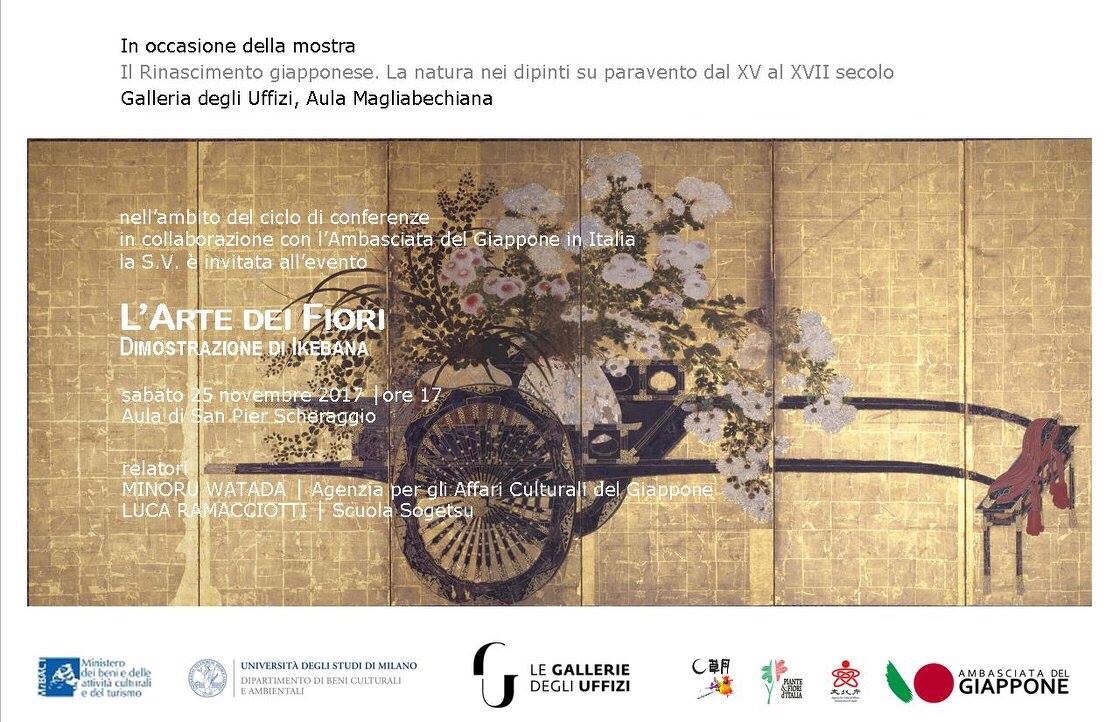 Sabato scorso si è tenuta agli Uffizi la dimostrazione di Ikebana del maestro Luca Ramacciotti. Questo incontro faceva parte della mostra “Rinascimento Giapponese” che vede esposti nelle sale degli Uffizi in tre momenti diversi alcuni bellissimi paraventi.